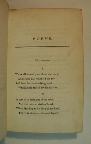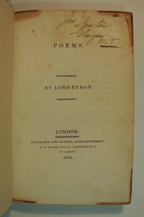 8vo., 7 separate works by Byron bound together in one, rather worn in later half calf binding. Poems (with) The Bride of Abydos (lacking title page) (and) The Corsair (same imprint), 1814 (and) The Siege of Corinth (and) Parisina (same imprint), 1816 (and) The Lament of Tasso (same imprint), 1817 (and) Manfred (same imprint), 1817 (and) Monody on the Death of Sheridan (same imprint), 1816